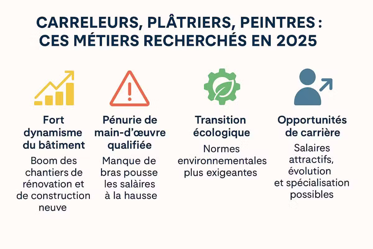 Les carreleurs, plâtriers et peintres sont au cœur de cette évolution. Ces métiers sont recherchés dans tous les chantiers, qu’ils soient neufs ou en rénovation. Les entreprises manquent de bras. La pénurie de main-d’œuvre pousse les salaires à la hausse et rend ces profils encore plus attractifs.